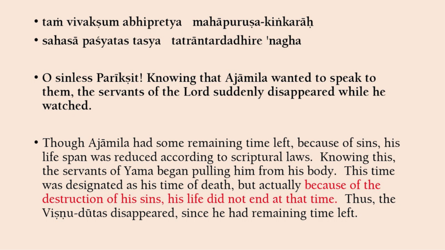 So, after this, then there is a little bit of description of what happened to Ajamil after he heard the Vishnudutas speak. So, Ajamil heard this conversation between the Vishnudutas and the Yamadutas, and then he was so surprised, he wanted to speak to the Vishnudutas, but they disappeared [Laughs]. So, Vishwanath Chakravarthi explains that actually Ajamil, of course, was about to die and the Yamadutas came. That happened, it wasn’t his actual karma. He had reduced his lifespan because of all of his sinful activity. So, his time got shortened and then the Yamadutas came to get him. But, technically, we say all of his sins were destroyed. So, the shortened life was no longer applicable [Laughs]. So, then Vishnudutas disappeared and he got life back, some lifespan back.
