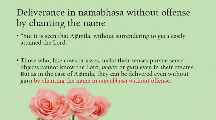 But then Ajamil didn’t have any Guru. He went to Vaikuntha [Laughs]. So, if one chants Namabhas without offense, then that is possible as in the case of Ajamil. So, that is the power of the name. If there is no offense and you chant Namabhas, you can actually get to Vaikuntha [Laughs].