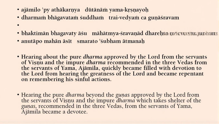 Hearing about the pure Dharma, that means Bhakti approved by the Lord from the servants of Vishnu, and the impure Dharma recommended in the three Vedas from the servants of Yamaraja, that’s normal, you know, Varnashrama Dharma. Ajamil quickly became filled with devotion to the Lord from hearing the greatness of the Lord and became repentant on remembering his sinful actions.