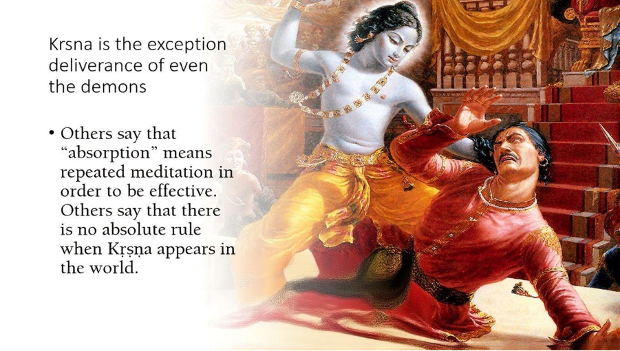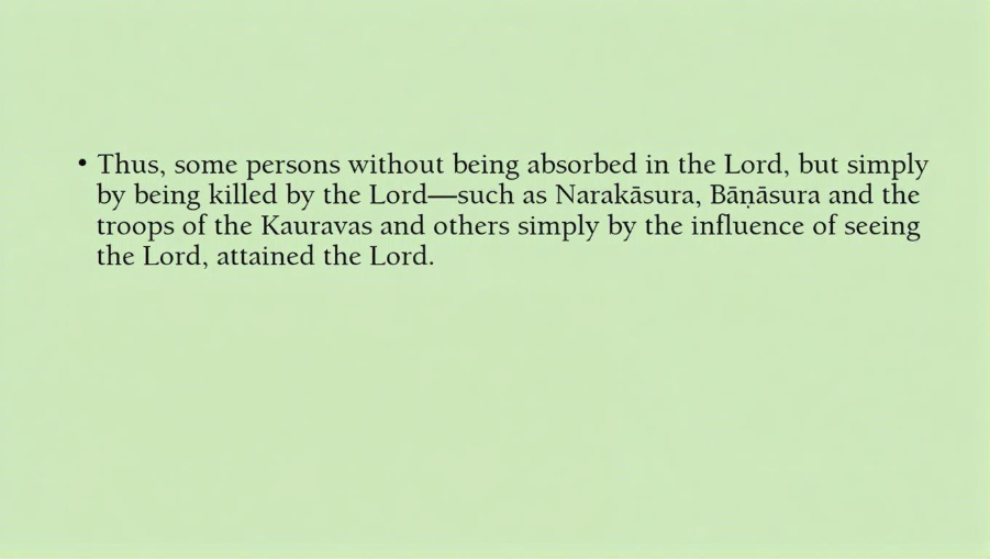 And thus, we find in Bhagavatam, it is said, “Some persons without being absorbed in the Lord, but simply by being killed by the Lord, Narakasura, Banasura and the troops of Kauravas and others, they attain the Lord.” Of course, they weren’t completely absorbed in the Lord, they at least saw the Lord [Laughs]. So, they attain the Lord, but usually what they get is liberation only. But we see Sishupala became the [Laughs] door keeper in the spiritual world [Laughs].