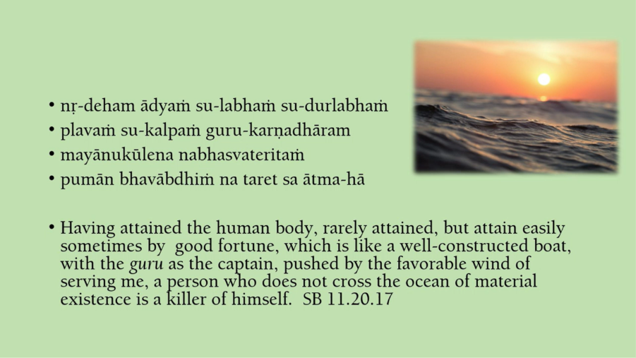 So, Vishwanath Chakravarthi quotes this particular verse from the 11th Canto. So, the human body is rarely attained, but you may get it by some good fortune. So, the human body is like a boat. And the boat is in the ocean of samsara. And Guru is like the captain of the boat which is in the ocean of samsara [Laughs]. And Guru is like the captain of the boat. And the favorable wind is service to the Lord.