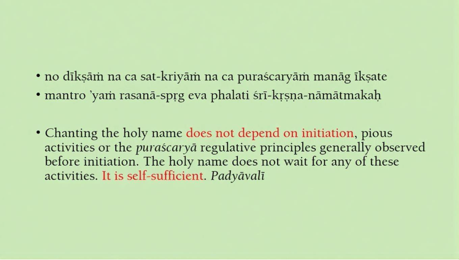 It is also said chanting the holy name does not depend on initiation [Laughs]. So, this is a statement by Rupa Goswami in Padyavali. The name does not depend on initiation, pious activities or purushcharya. The holy name does not wait for any of these activities. Even if you don’t do them, you can start chanting and get perfection.