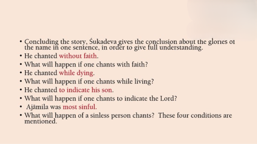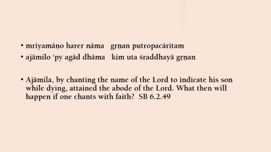 So, Vishwanath Chakravarti explains at the end of the story, that Ajamil, he chanted without faith. So, how much more result you will get if you had faith. He uttered the name while he was dying. So, what if you chant when you are living [Laughs]? He chanted to indicate his son. So, what if you chant and you are really understanding this means Supreme Lord. Ajamil chanted in the most sinful state. So, how much greater result if you chant without sin at all. So, he gives four conditions by which even then Ajamil got such a great result. So, if you chant with faith, with devotion, during your whole life to indicate Supreme Lord, with knowledge and without any sin, you get greater result. And if you chant the name of Krishna, you get even 3000 times greater result [Laughs]. So, that ends this particular glorification of the name.